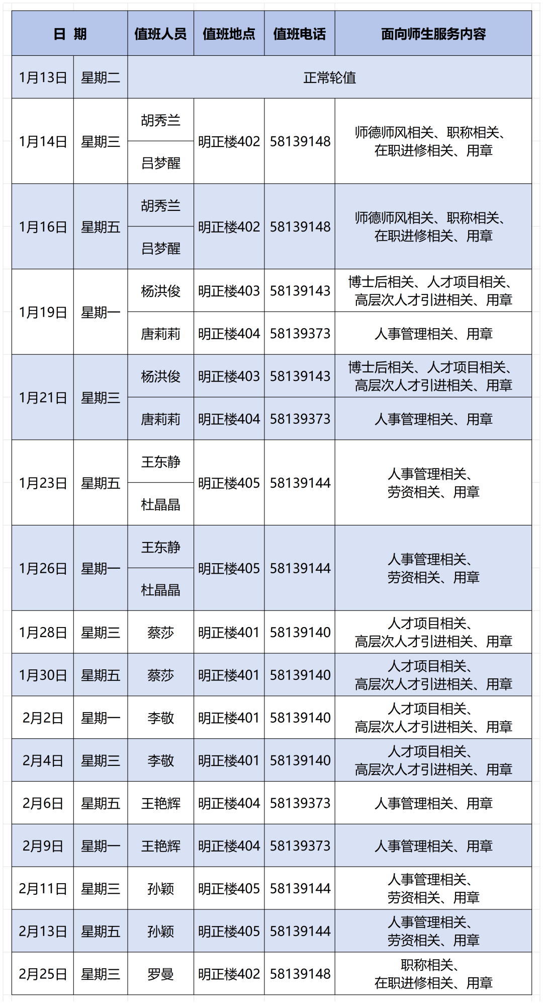 2026年寒期党委教师工作部、人事处面向师生服务安排